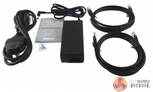 The box bundle contains a Delta Electronics DPS-65VB 65W power adapter, a pair of Cat5e LAN cables, enough screws to secure 2.5 drives in the drive bays if required and a Quick Start Guide.
