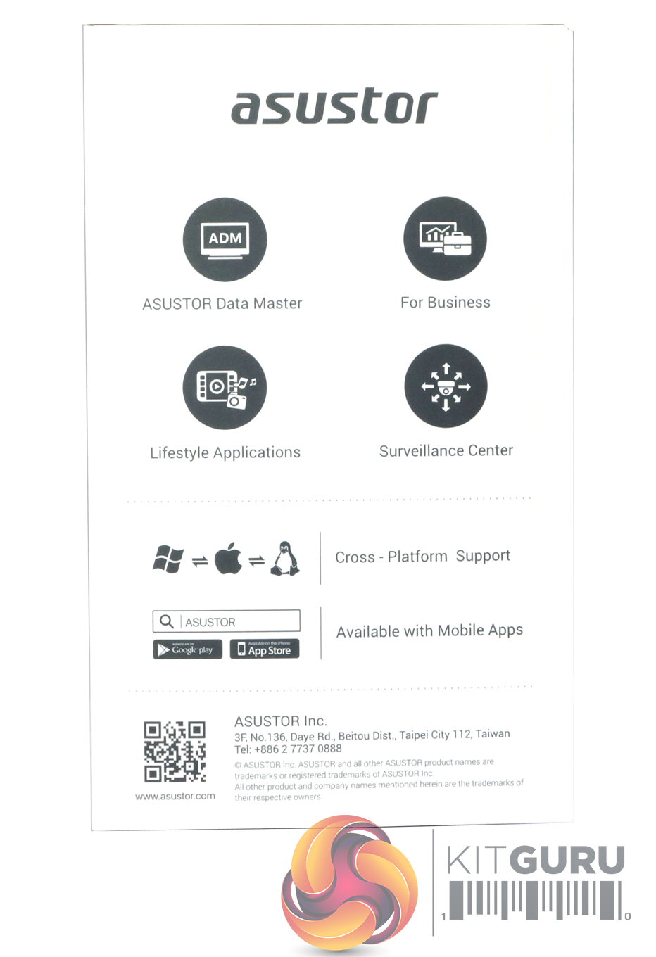 The other end panel displays icons for; Asustor Data Master, For Business, Lifestyle Applications and Surveillance Center. Under this are icons displaying cross platform support and mobile app support.