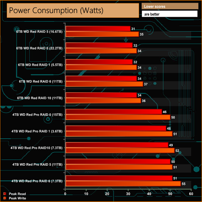There's no real surprise in the arrays built with WD's standard Red drives showing less power usage than the ones built with Red Pro drives as the standard Red drives use power a bit more thriftily than their faster spinning cousins; average peak read/write power requirements for the 6TB Red drives is 6.4W and 5.2W at idle while the 4TB Red Pro's peak at 8.6W with 6.5W used during idling.