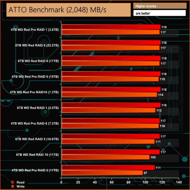 With a dual core processor and a decent chunk of dual channel memory the AS6104T is no slouch when it comes to overall performance topping the 100MB/s mark for all RAID arrays with the exception of the 4 x 4TB RAID 5 score which was under the magic 100MB/s but at 97MB/s it really is splitting hairs.