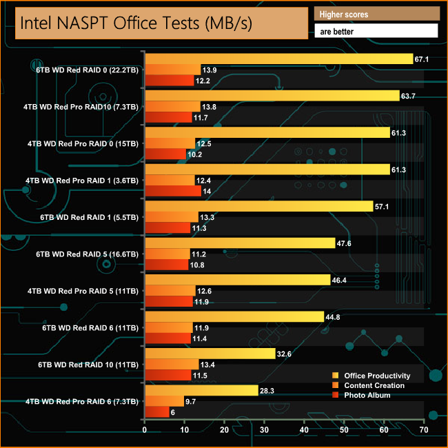 When it comes to dealing with everyday workloads the AS6104T handles them without too much difficulty. It also shows pretty good consistency across the range when it comes to the multi file/file type Content Creation test and when faced with opening multiple small files in the Photo test. Once again the exception is when the device is using four 4TB disks in a RAID 6 array.