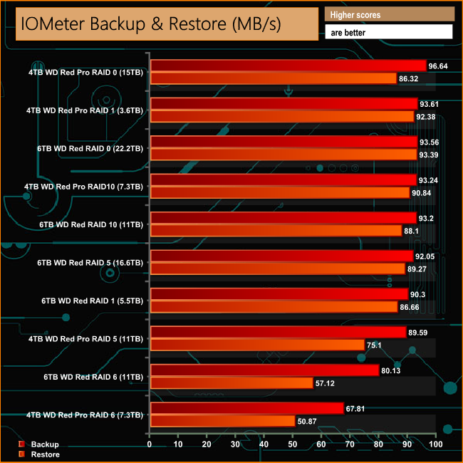 We set IOmeter up (as shown above) to test both backup and restore performance on a 100GB partition.