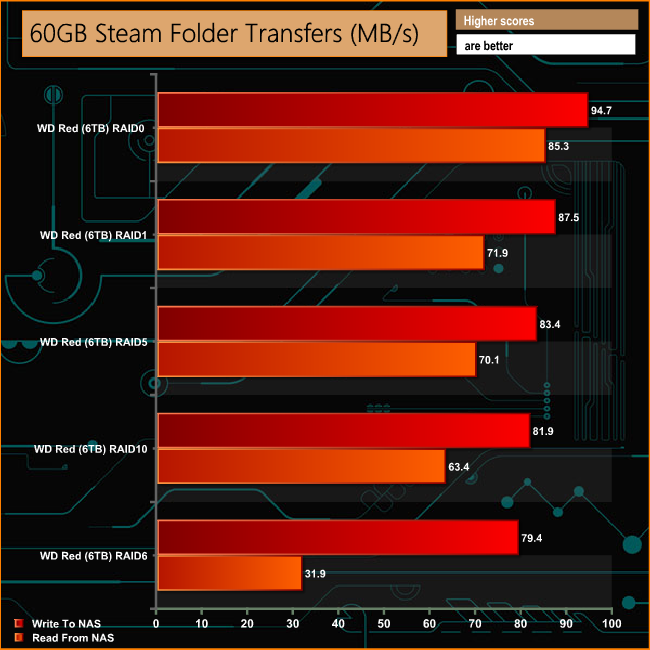With the 50GB file folder transfer, the read performance in RAID 5 is strong at 53MB/s with all the other arrays struggling to get close to that read figure.