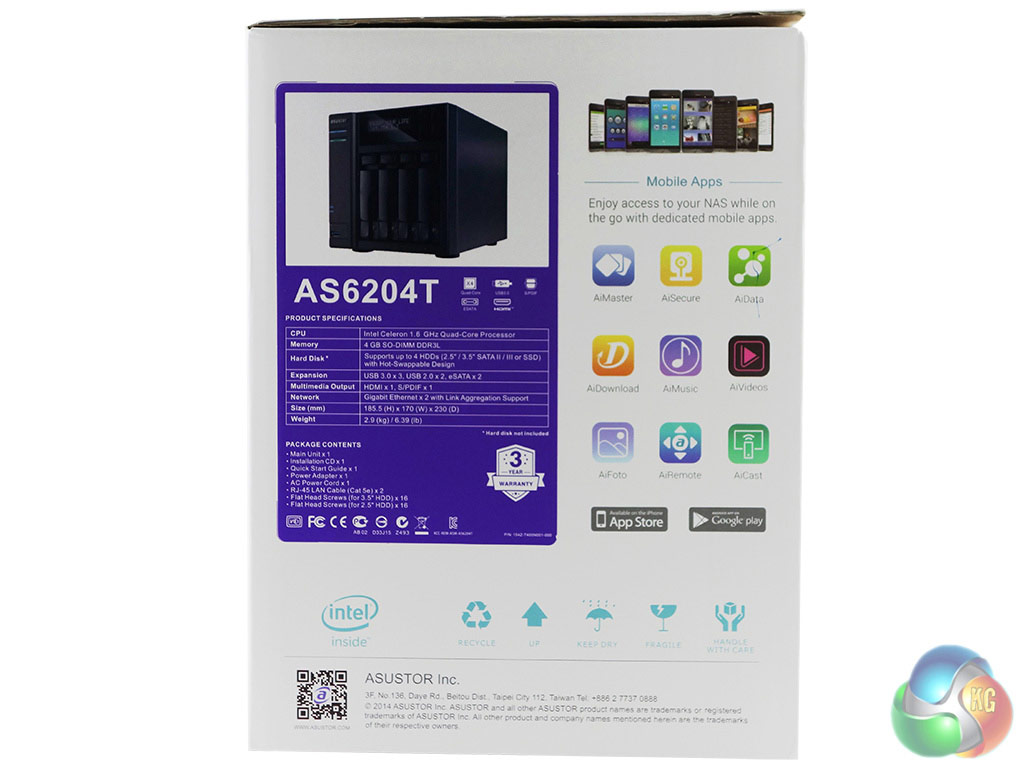 The Asustor AS6204T ships in a fairly large box with an image of the unit alongside its dual-core sibling, the AS6104T. There is also a row of icons informing you that this is more than just a storage device.