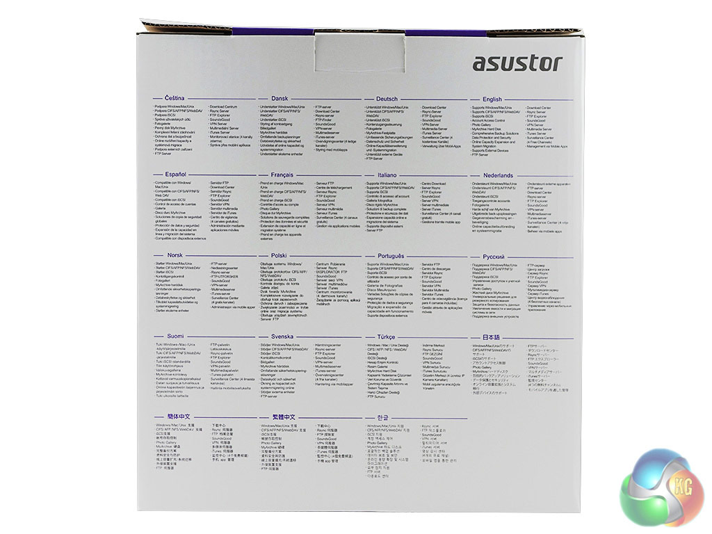 One side of the box has a small specifications panel, a list of what is in the box and information about the mobile apps that are available for the AS6204T. The other side of the box has information about the ADM OS and a list of other four-bay Asustor NAS units that are available, with some of their features.