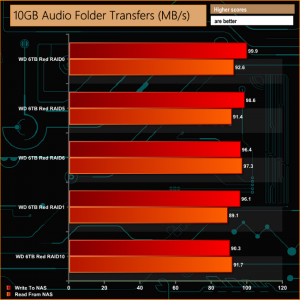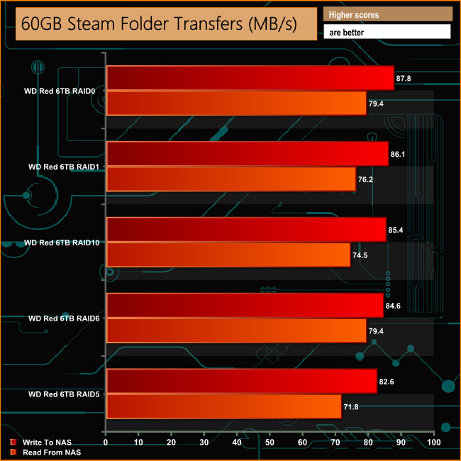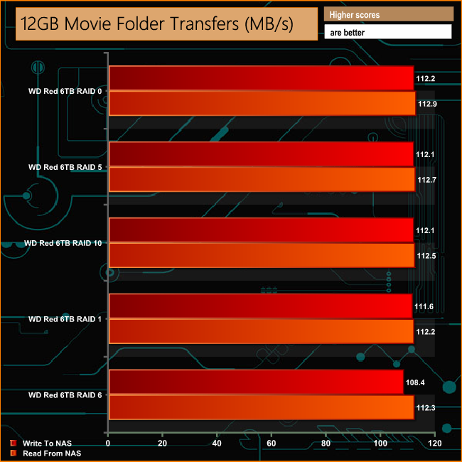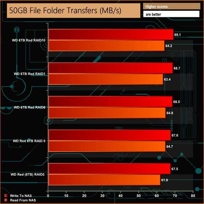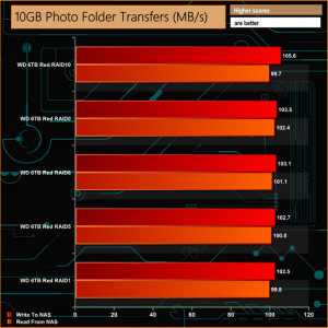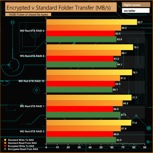 As can be seen from the graph, the engine helps bolster performance during these folder transfers dropping just 17MB/s in RAID 5 when writing to the NAS.