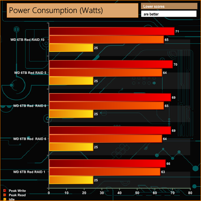 The AS6208T uses around 70W of power when being pushed hard writing to the disks and around 64W when in peak read mode. For a device with eight hard drives in that's pretty good but having a CPU with a TDP of just 6W and using hard drives with an active rating of just 5.3W does help keep the peak power figures down.