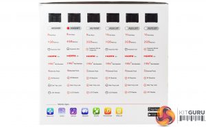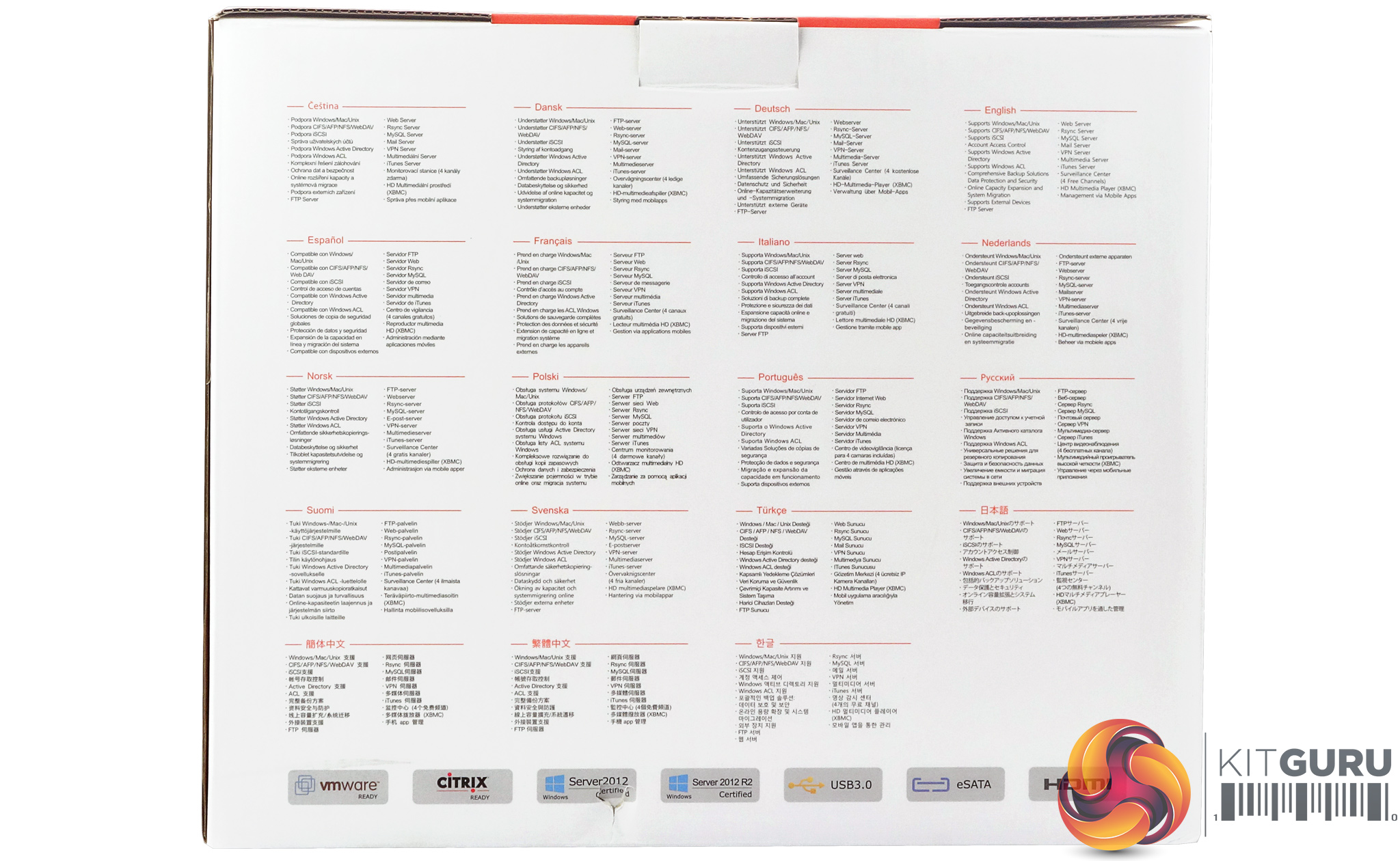 The bottom right-hand side of the box displays a group of icons representing what the device supports and can be used for. The rear of the box has multilingual lists of some of the services and functions the AS6208T supports.