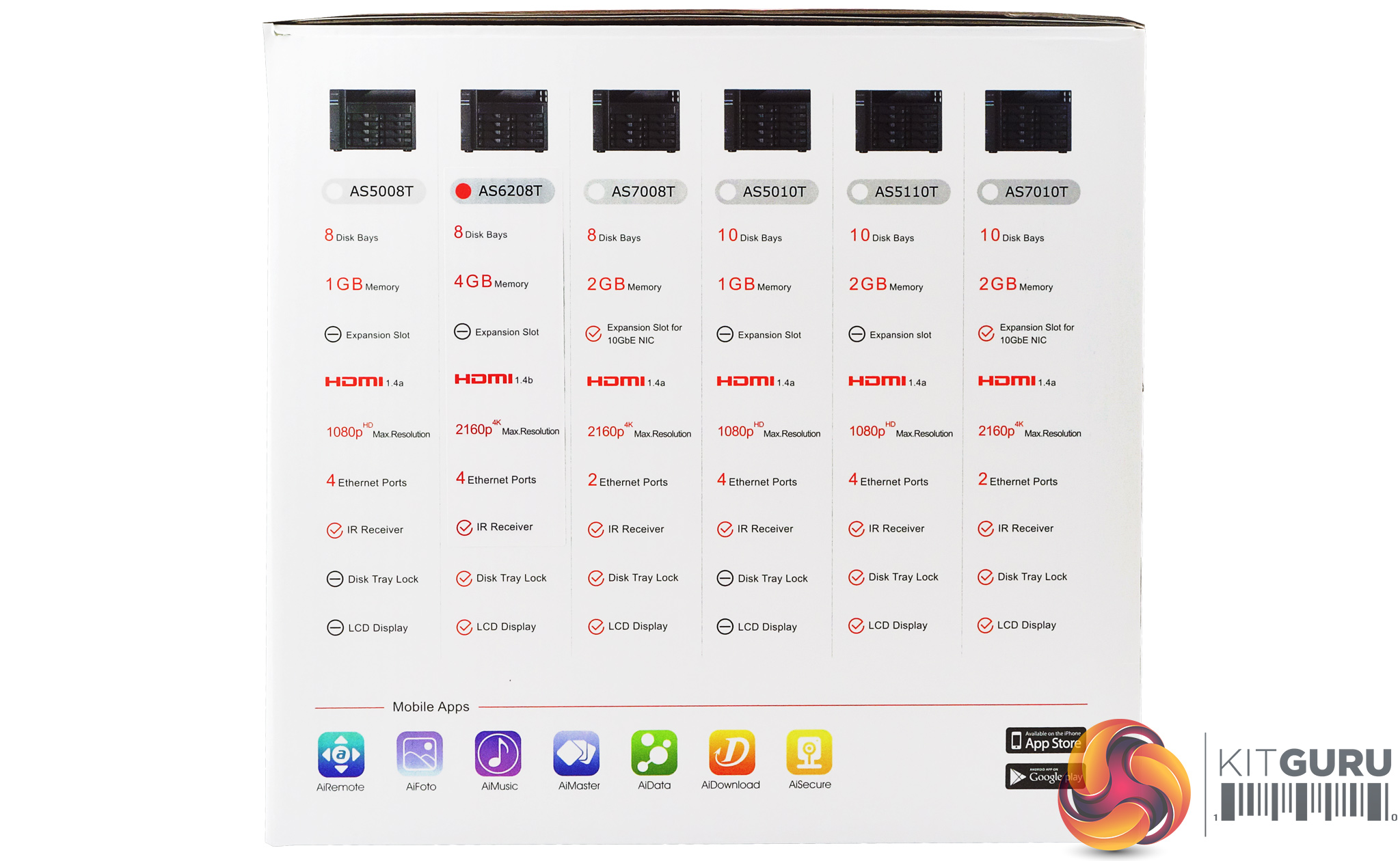 As you might imagine, an eight bay NAS ships in a rather large box. The front of the box oddly has images of the AS5008T eight bay NAS and the AS5110T/AS7010T ten bay NAS with just a sticker showing an outline image of the AS6208T.