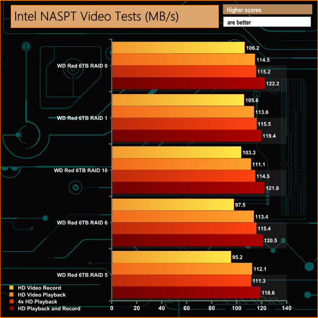 The AS6208T dealt with the video tests of Intel's NASPT benchmark comfortably, scoring above 100MB/s in all bar two test runs. The two exceptions were in the HD Video Record test runs of RAID 5 and 6 modes where the performance was just shy of the 100MB/s mark at 97.5MB/s and 95.2MB/s respectively.