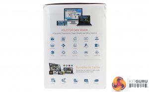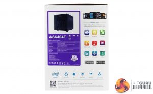 One side of the box has a small specifications panel, a list of what is in the box and information about the mobile apps that are available for the AS6404T. The other side of the box has information about the ADM OS and the Surveillance Center app.
