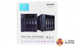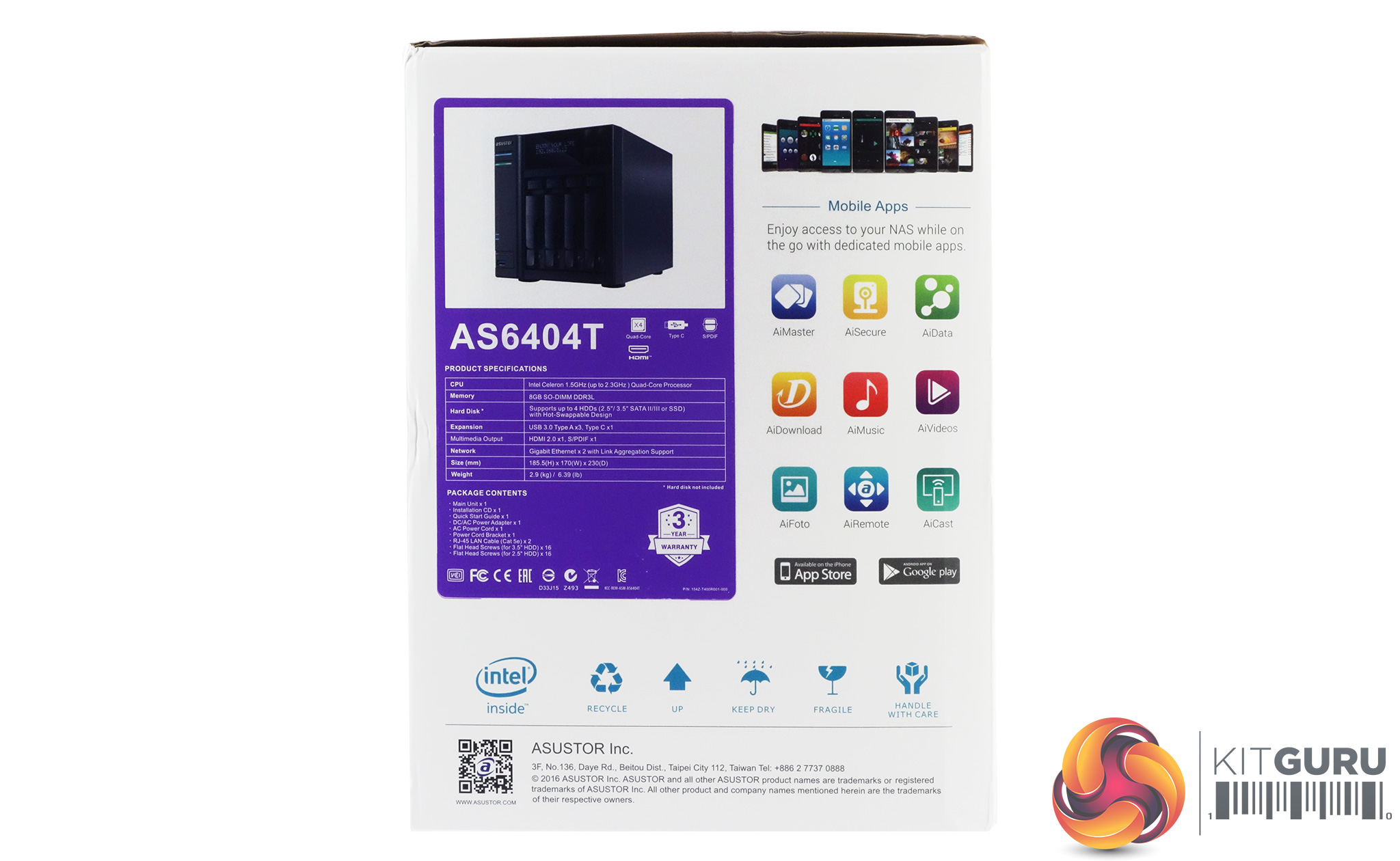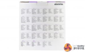 The Asustor AS6404T ships in a fairly large box with an image of the unit alongside what appears to be its dual-core sibling, the AS6104T (there are no drive bay locks on the second image). There is also a row of icons informing you that this is more than just a storage device, something you can say about most of today's NAS devices, and three icons informing that the AS6404T supports Windows, Mac OS (OS X 10.6 onwards) and Linux. The rear of the box is covered by multilingual resumes of some of the AS6404T’s features.