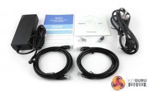 Inside the accessories box, there is a Delta Electronics DPS-90AB-3 90W AC adapter, a pair of Ethernet cables, a selection of screws for both 3.5″ and 2.5″ drive installations, a quick installation guide and a software CD.