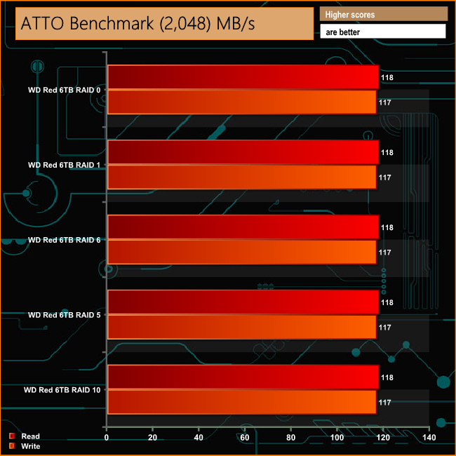 With a single Gigabit connection, Asustor quote throughput performance for the AS6404T at 104MB/s for reads and 110MB/s for writes. We were able to confirm these figures and indeed better them a little under testing. The ATTO benchmark gave figures of 118MB/s for reads and 117MB/s for writes for all the arrays tested, about as fast as you going to get out of a single Gigabit connection.