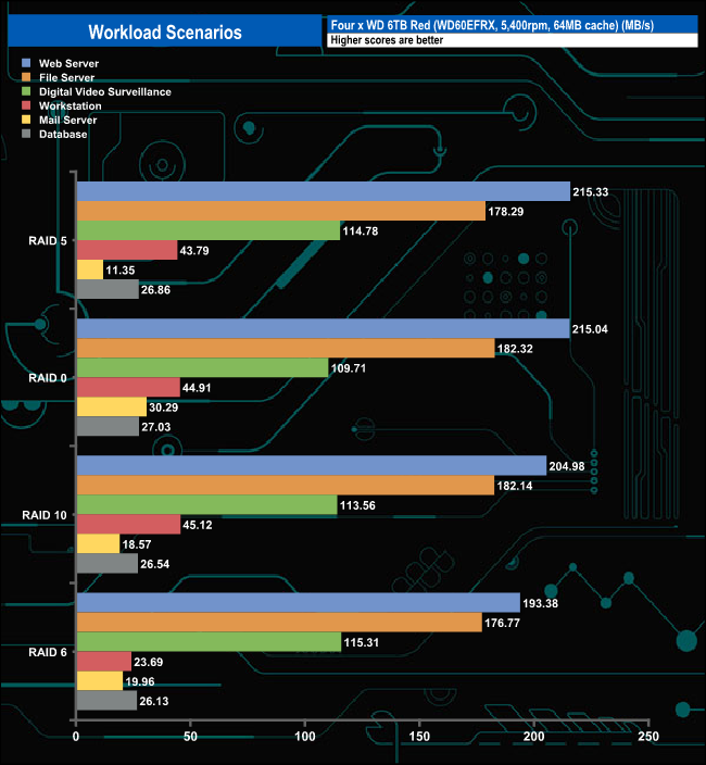 We also tested the NAS in a few scenarios it might be used for in an office environment. The best performance with all the tested arrays came via the File Server test. The fastest speed of 215.33MB/s came from a RAID 5 array while the slowest, 193.38MB/s came from a RAID 6 array.