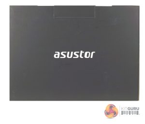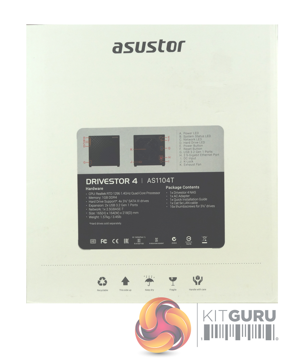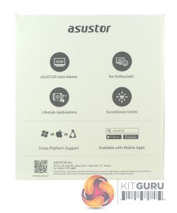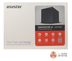 The Drivestor 4 comes in a compact box. The front of the box has a large sticker on it displaying an image of the drive along with the model number. Under the image is two rows of icons that display some of the NAS features; Quad-Core ARM CPU, USB 3.2 Gen 1, 2.5GbE, Toolless installation, Wake on Wan, Ultra Quiet and 3-year warranty. Also, there is a QR code for more product information. The rear of the box is just plain black with the Asustor name picked out in white.