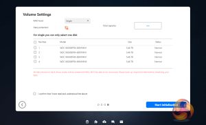 Once the ACC has located the NAS and you select it, the welcome screen appears. There are two ways to set up the device; 1-Click Setup and Custom. With the 1-Click method, you simply enter a name for your NAS, choose a password and then select how you want the storage to be set up and that’s about it. The Custom method gives you more detailed choices as can be seen from the screens below.
