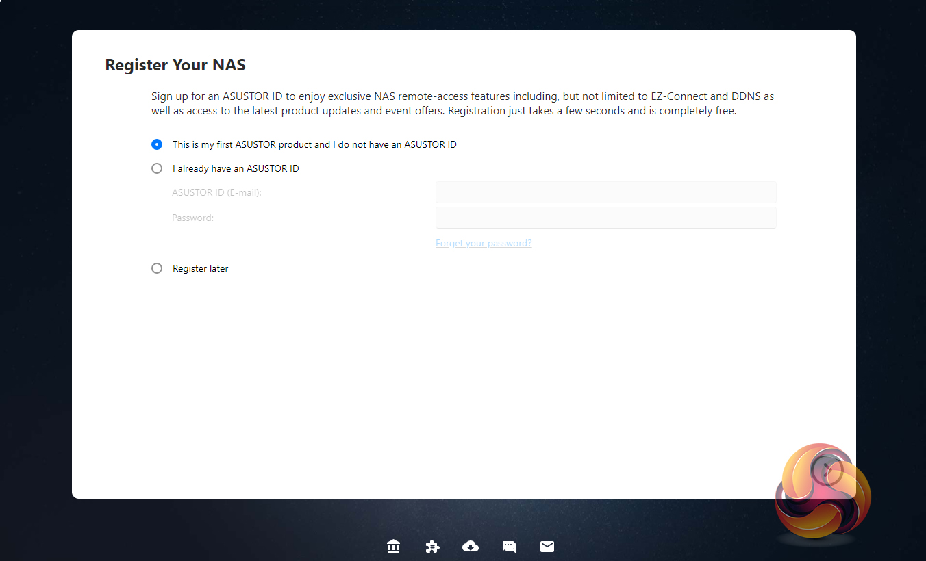 The last job is the register the NAS. Registering it provides an Asustor ID which you will need to download apps from App Central. It will also be needed if you should require the technical support centre.