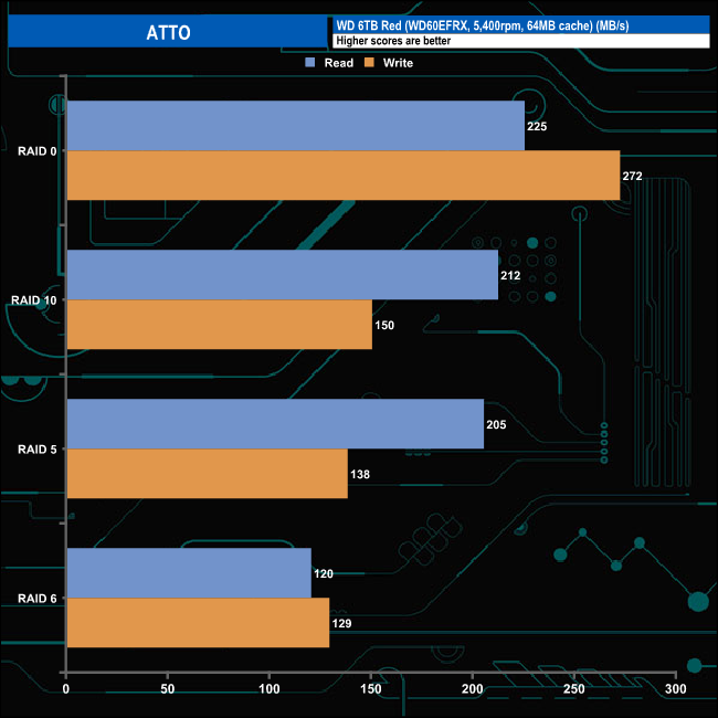 Asustor rates the Sequential (SMB 512KB) read/write performance of the Drivestor 4 as 214MB/s and 266MB/s respectively. These figures were obtained from a Drivestor 4 loaded with four Seagate IronWolf 110 SSDs built into a RAID 5 array. We used 6TB WD Reds to test the NAS and the best figures we got with the ATTO benchmark for a RAID 5 array were 205MB/s for reads and 138MB/s for writes. The fastest speeds we saw were 225MB/s for reads and 272MB/s for writes when the drives were tested in a RAID 0 array.