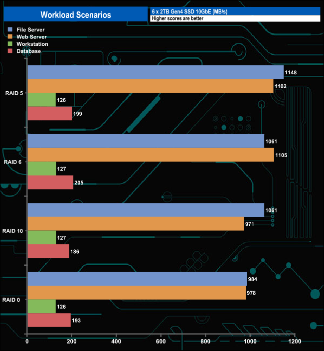 We also tested the NAS in a few scenarios it might be used for in an office environment. The best performance with all the tested arrays came via the File Server test with the fastest speed of 1,148MB/s coming from the RAID 5 array closely followed by the Web Server scenario in a RAID 6 array with a speed of 1,105MB/s.