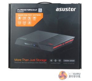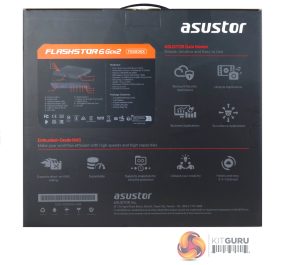 The Flashstor 6 Gen 2 comes in a fairly compact box complete with a carrying handle. On the front is a 3/4 front view image of the unit. Above the image is a label displaying logos of the headline features of the NAS; Quad-core CPU, two USB 4.0 ports, three USB 3.2 Gen 2 ports, 6 NVMe M.2 slots, 8GB of DDR5 memory, 10GbE port and a three-year warranty. Under the image there are two groups of icons, three represent the platforms that the Flashstor 6 supports – Windows, Mac OS and Linux and two for the Apple and Android mobile app support. The image also shows how one side lights up when the power is on.