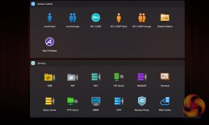 The main ADM page shows the major sections of the OS. At the top of the main menu window are five icons; To the right there is admin, system announcements, tools and preferences, the search function is on the left had side. The admin drop-down has four options; personal, restart, power off and sign out. The personal section is where you can configure the account password, E-mail address, description, ADM language. In this section, you can also set the theme the NAS uses. Selecting the Tools option drops down a window that can display various NAS functions for easy monitoring. These include Storage Manager, Activity Monitor, Users and important log events. The search icon links to Searchlight, Asustor’s own search tool, designed for running fast and precise searches for files on the NAS.