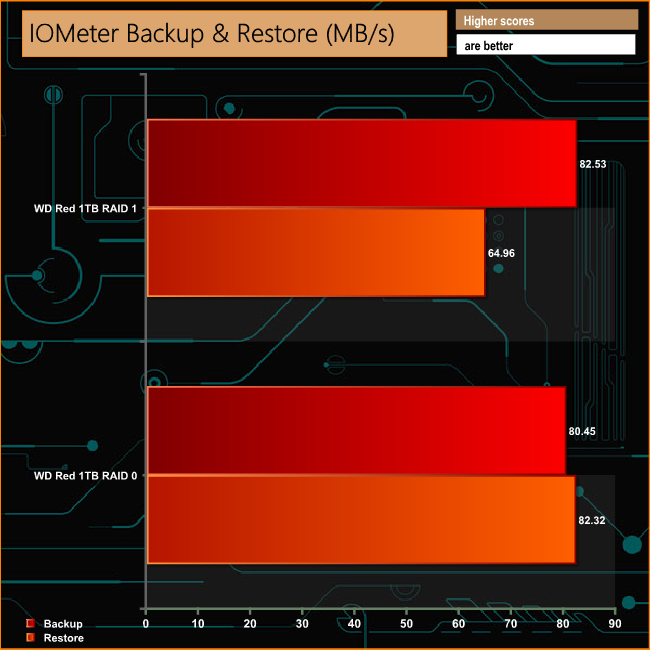 Apart from when restoring the data in a RAID 1 array, the TeraStation TS3210DN shows very consistent performance when backing up data and restoring it.