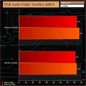 When dealing with real life data the TeraStation TS3210DN shows a good level of consistency across the arrays when handling all sorts of data. The NAS performs the fastest when dealing with the large file sizes of the 12GB Movie folder when it tops the 100MB/s barrier for all operations in both array modes.