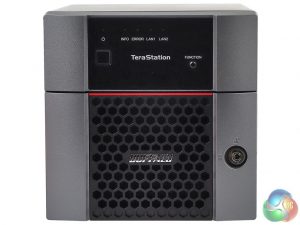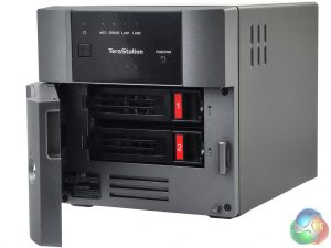 The TeraStation TS3210DN is a compact front loading tower design with a metal chassis and cover and a good quality plastic bezel. The front bezel is split horizontally, the bottom half is made up of the drive bay door with the power button, function button and indicator lights all in the top half.