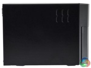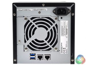 The back panel is dominated by the grill for the cooling fan. Above this is the power connector for the mains lead. Sitting below the grill are a pair of LAN ports (which support Link aggregation) next to which are a stacked pair of USB 3.0 ports.