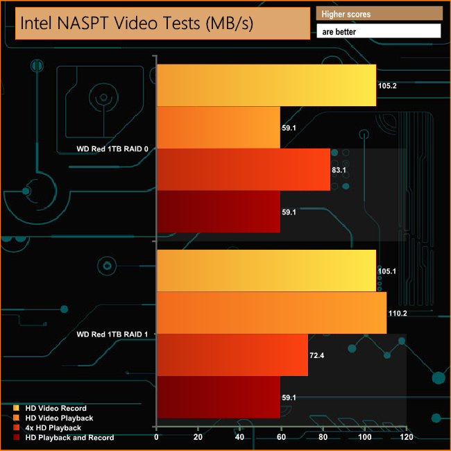 With the notable exception of the HD Video Playback test in RAID1, the results of the video part of the NASPT benchmark are pretty well matched between the two arrays. However, in RAID1 the HD Video Playback test gives almost double the MB/s figure than when tested in RAID0.