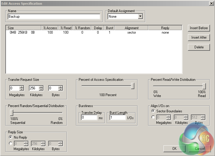 We set IOmeter up (as shown above) to test both backup and restore performance on a 100GB partition.