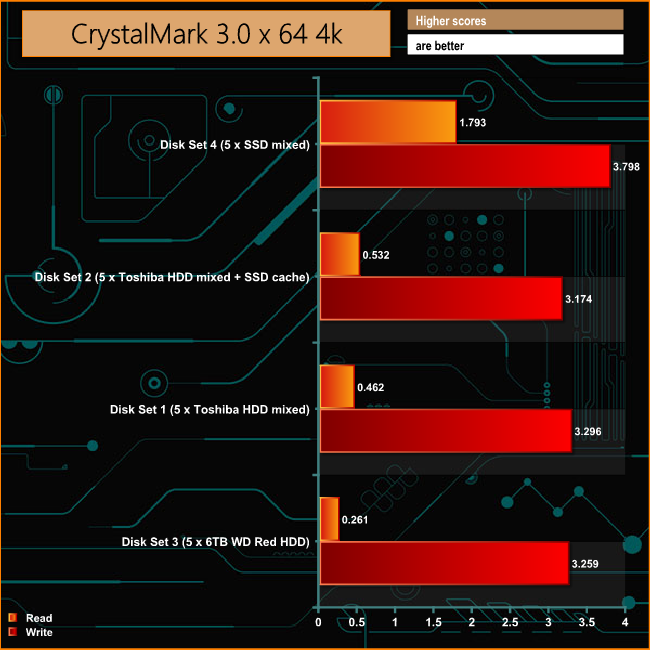 It comes as no great surprise to see that the SSD setup is the fastest when it comes to reads and writes. The SSD cache gives the mixed Toshiba drive setup a small boost in read performance.