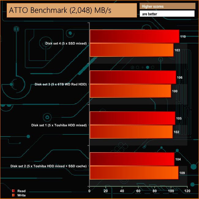 The Drobo 5n is a consistent performer across all the different types of disk setups, breaking the 100MB/s mark across the board.