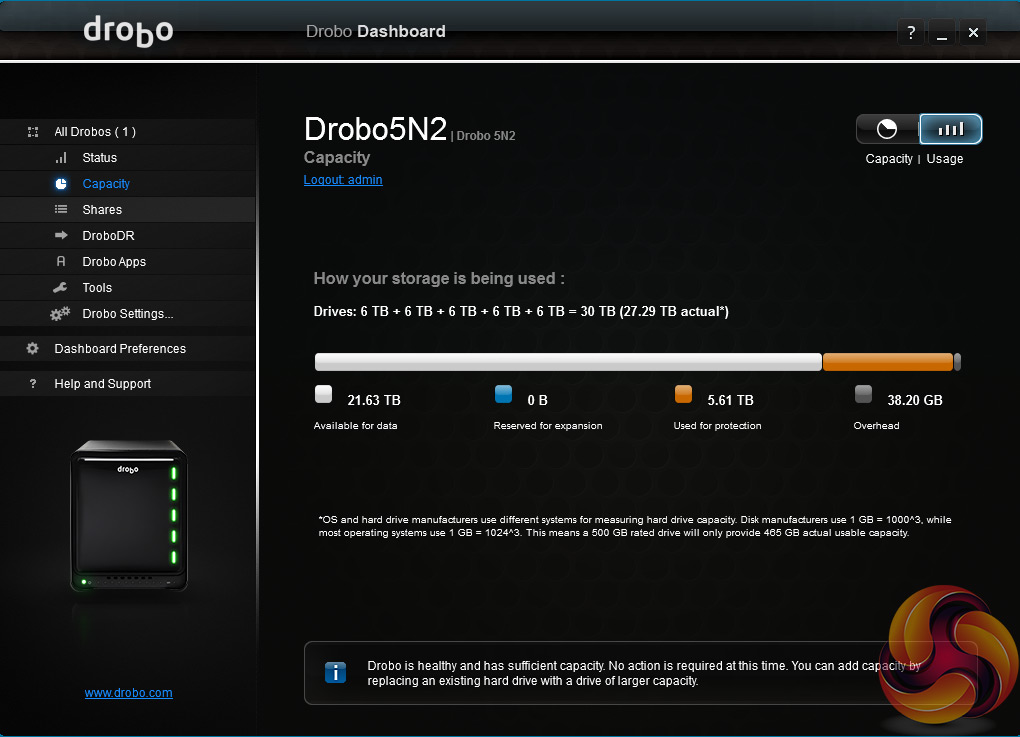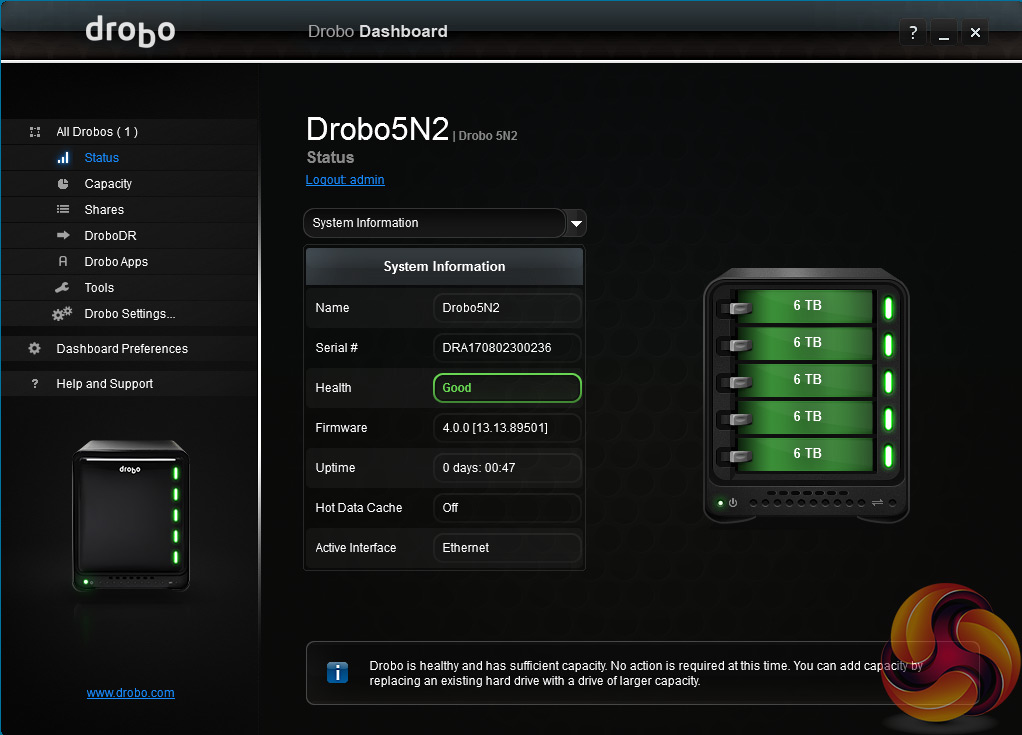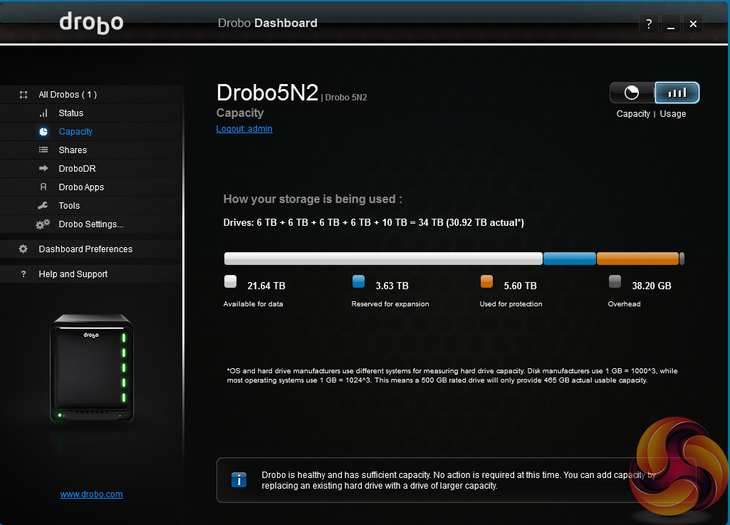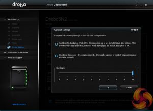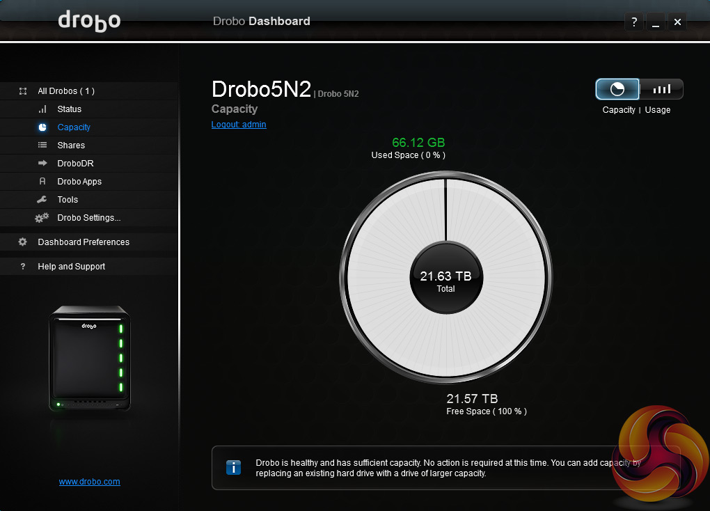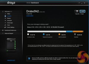 The Drobo 5N2 is really easy and straightforward to set up. Once the drives are loaded it's a matter of downloading Drobo's Dashboard OS and begin the install. Once the installation starts, the main Dashboard screen appears with an icon of the 5N2 complete with yellow alert lights. Once the install is complete, the yellow lights turn green. The whole procedure takes around 20 minutes to complete.