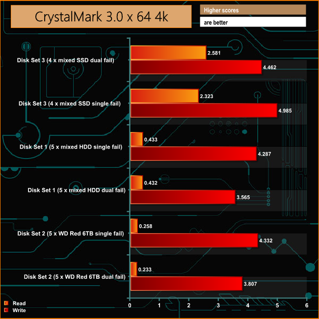 It's no real surprise to see the SSD disk sets completely outperforming the HDD sets when it comes to reading the very small files of everyday use as can be seen by the read result of CrystalDiskMark's 4K test. The faster spin speeds of 3 out of the 5 disks in the mixed HDD disk set give it the edge over the WD Red set when it comes to read performance.