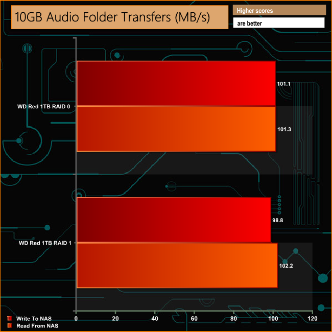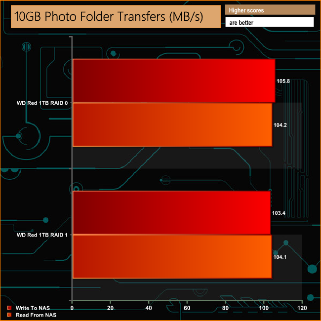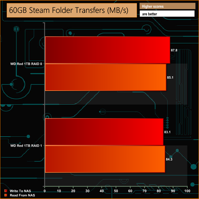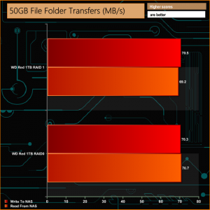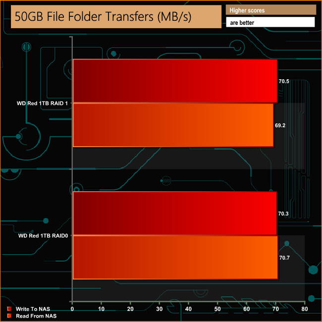 Dealing with our real life file folder tests didn't cause the ioSafe 216 any problems at all. Even the 50GB File Folder which some devices struggle with in comparison to Steam folder was dealt with pretty well, at an average of 70.4MB/s writing to the 216 and 69.9MB/s reading the data back.