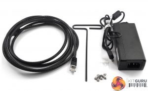 The box bundle consists of a 60w power adapter, a LAN cable, mounting screws for two hard drives and a 3mm Hex Tool for opening the front and inner panels.