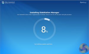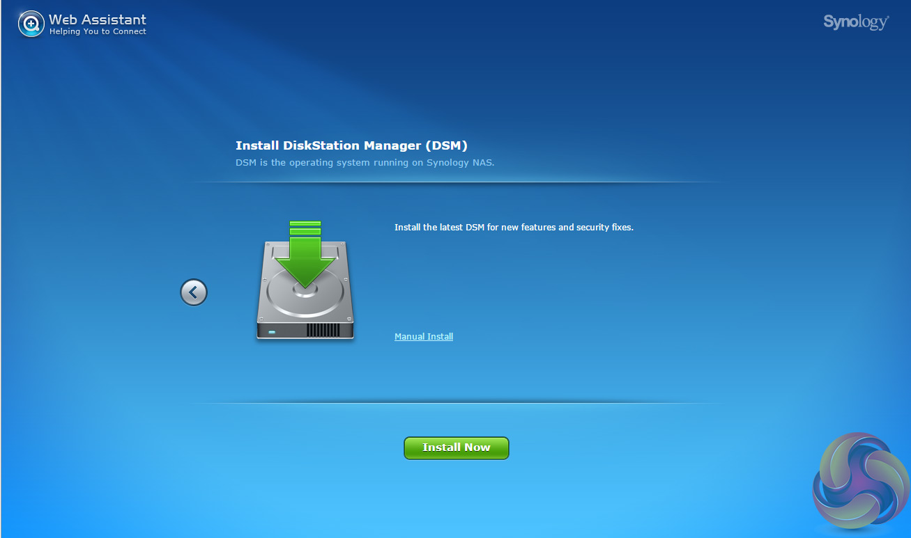 Once the NAS is found, the first window of the DSM setup wizard appears. Pressing install (there's also a manual install option to install a downloaded instance of DSM ) automatically downloads the latest version of DSM and starts installing it after reminding you that any data on the hard disks will be deleted.