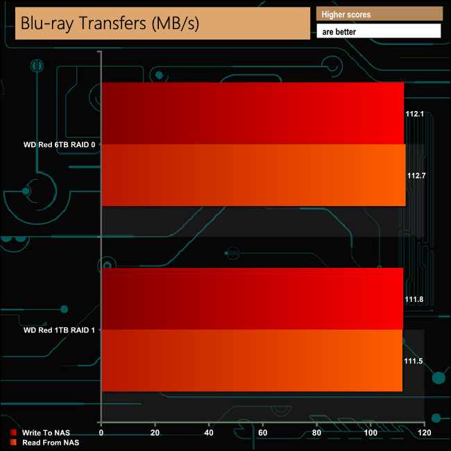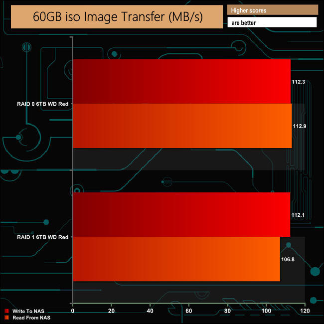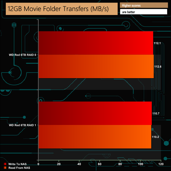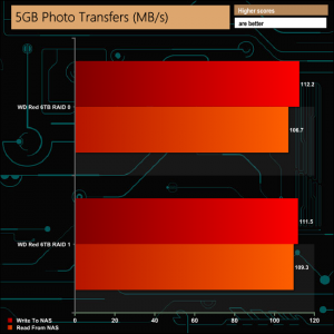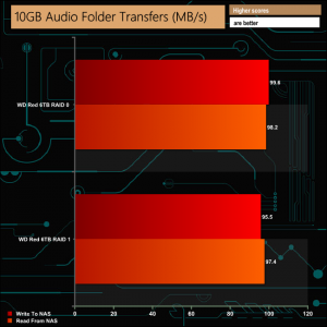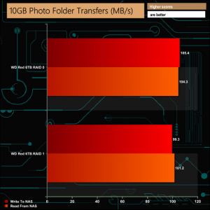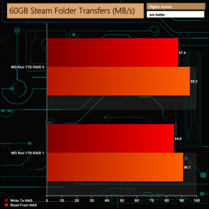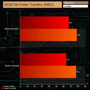 The NAS handled our real life file transfer tests without any problems and showed very good consistency throughout all the tests. It was more efficient handing large files than small ones as can be seen by the comparing the results of the transfer tests for the 60GB Steam, 50GB file and 10GB audio folders against all the rest.