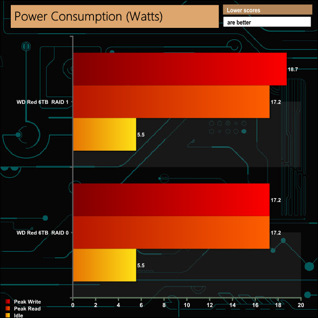 For our testing we used a pair of 6TB WD Red drives which are pretty frugal in their power requirements; 0.4W standby/sleep, 3.4W idle and 5.3 Watt active.