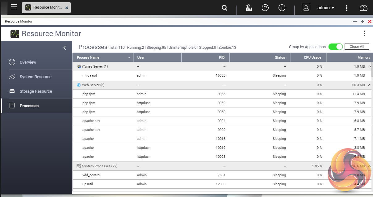 The Resource Monitor is a very useful tool, monitoring elements and offering detailed information on how the storage of the NAS is being used. It is divided into four sections; Overview, System (with separate tabs for the CPU, Memory and Network), Storage (with separate pages for pool, RAID and disk activities and how the storage space is being used) and Processes.