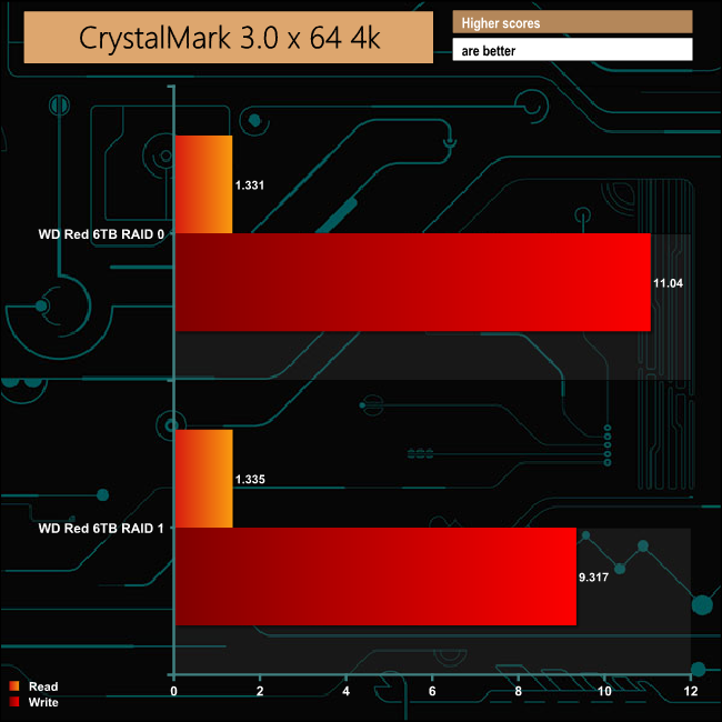 There's nothing to separate the two arrays when it comes to read performance with RAID 0 having a slight advantage when it comes to write performance.