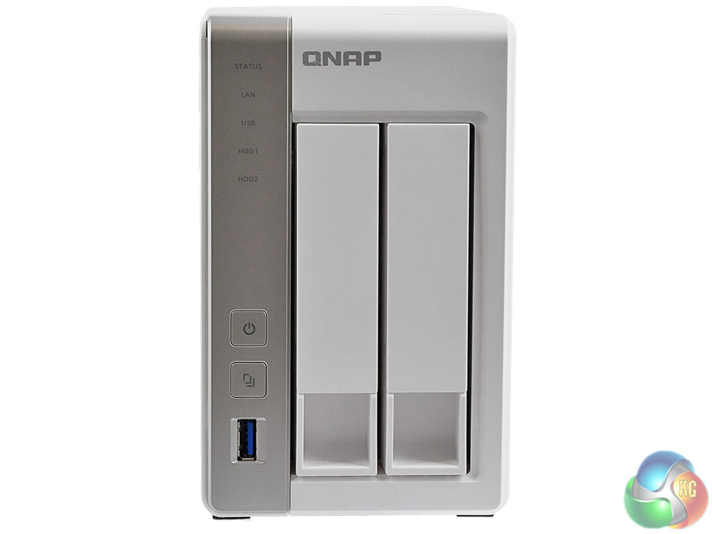 The Qnap TS-213P is a compact front loading tower design with a metal chassis and cover and a plastic front bezel. The left-hand side of the bezel holds a vertical set of indicator lights, the power button and One Touch Copy button to use with the front USB 3.0 port. The indicator lights are for (from the top); Status, LAN connection, USB, and two for Disk Activity/Status.