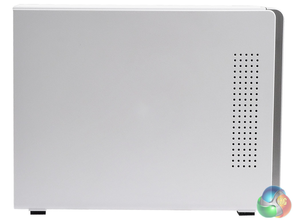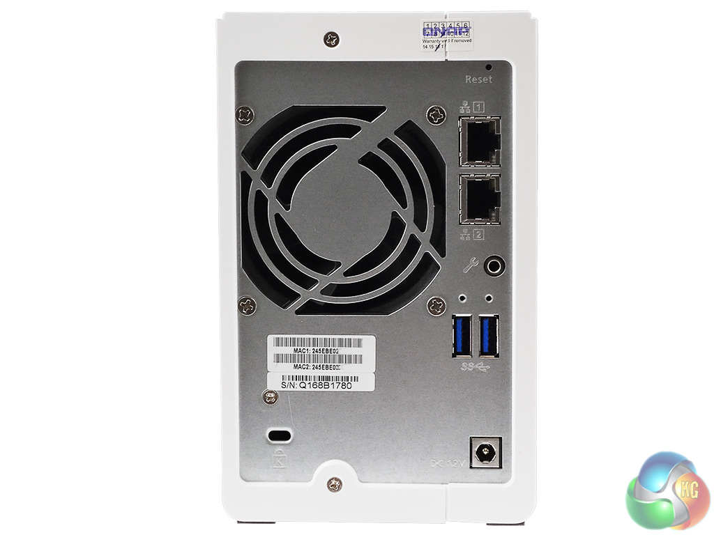 The rear panel of the unit is dominated by the grill for the Y.S.Tech FD127025MB, 4,000rpm 70mm cooling fan. To the side of this are all the ports, comprising a pair of RJ45 Gigabit Ethernet ports (which support link aggregation), a pair of USB 3.0 ports, a Kensington security slot and the 12v power input.