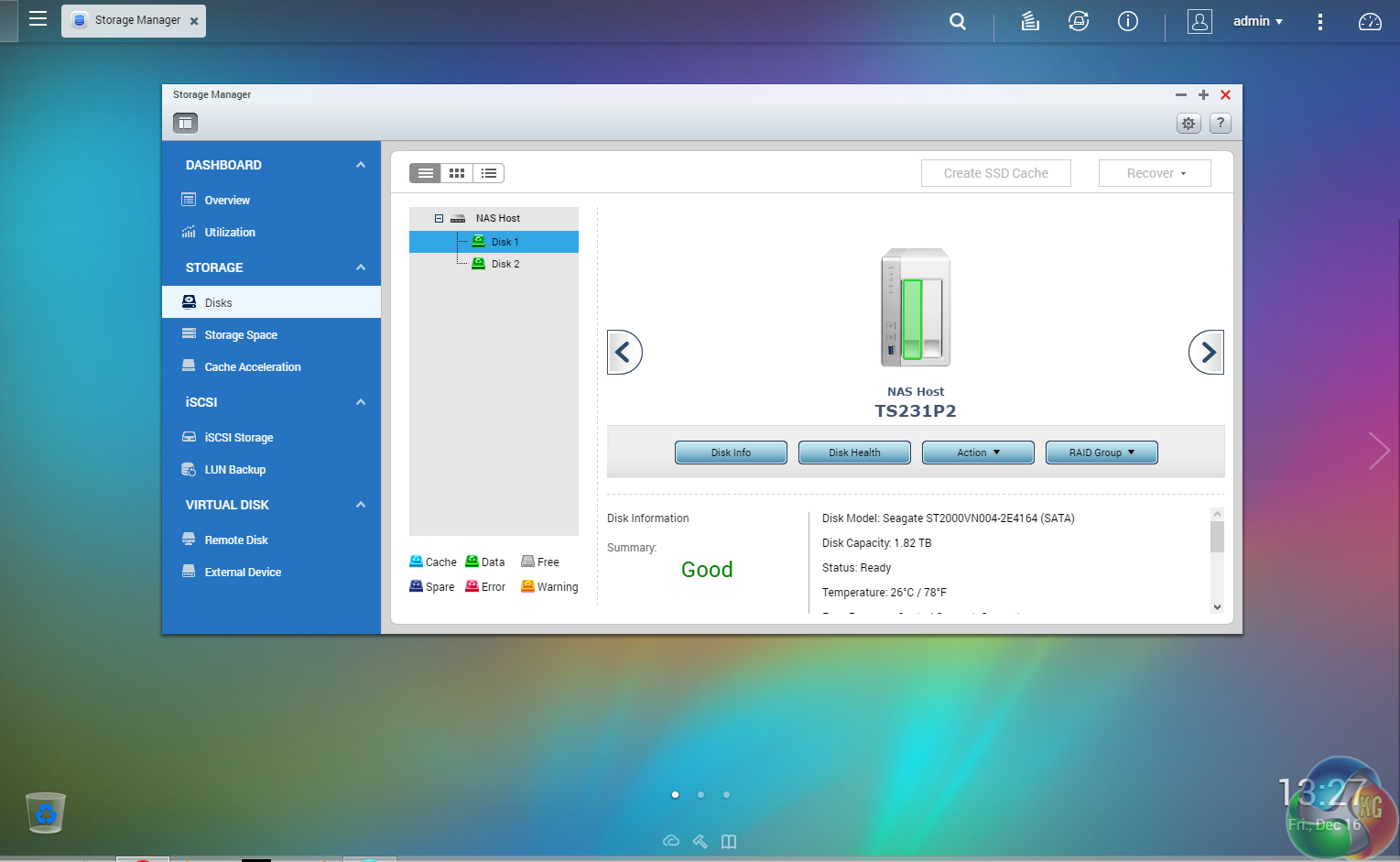 Storage Manager gives you complete control over setting up drives and volumes, in addition to showing how the capacity of the NAS is being used and warnings of potential failures. The Storage/Disks/VJBOD sub-menu displays individual drive information and health with a handy graphical display showing which drive is being interrogated.