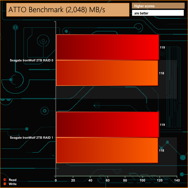 Despite only having a dual cored CPU and that 1GB of DDR3 memory, the TS-231P shows a pretty good turn of speed in both arrays in the ATTO benchmark.