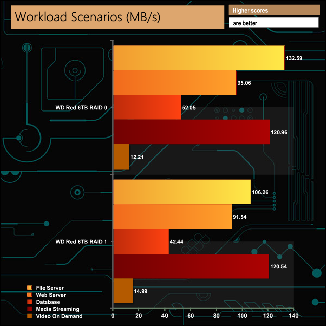 With our workload tests, the RAID 1 performance holds up pretty well against the RAID 0 performance with the exception of the File Server trace.