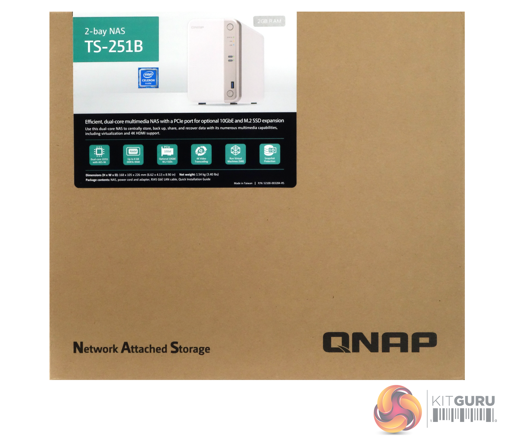 The TS-251B comes in a compact box with an image of the drive on the front label. A sticker on the top right of the label displays the amount of memory the unit comes with.