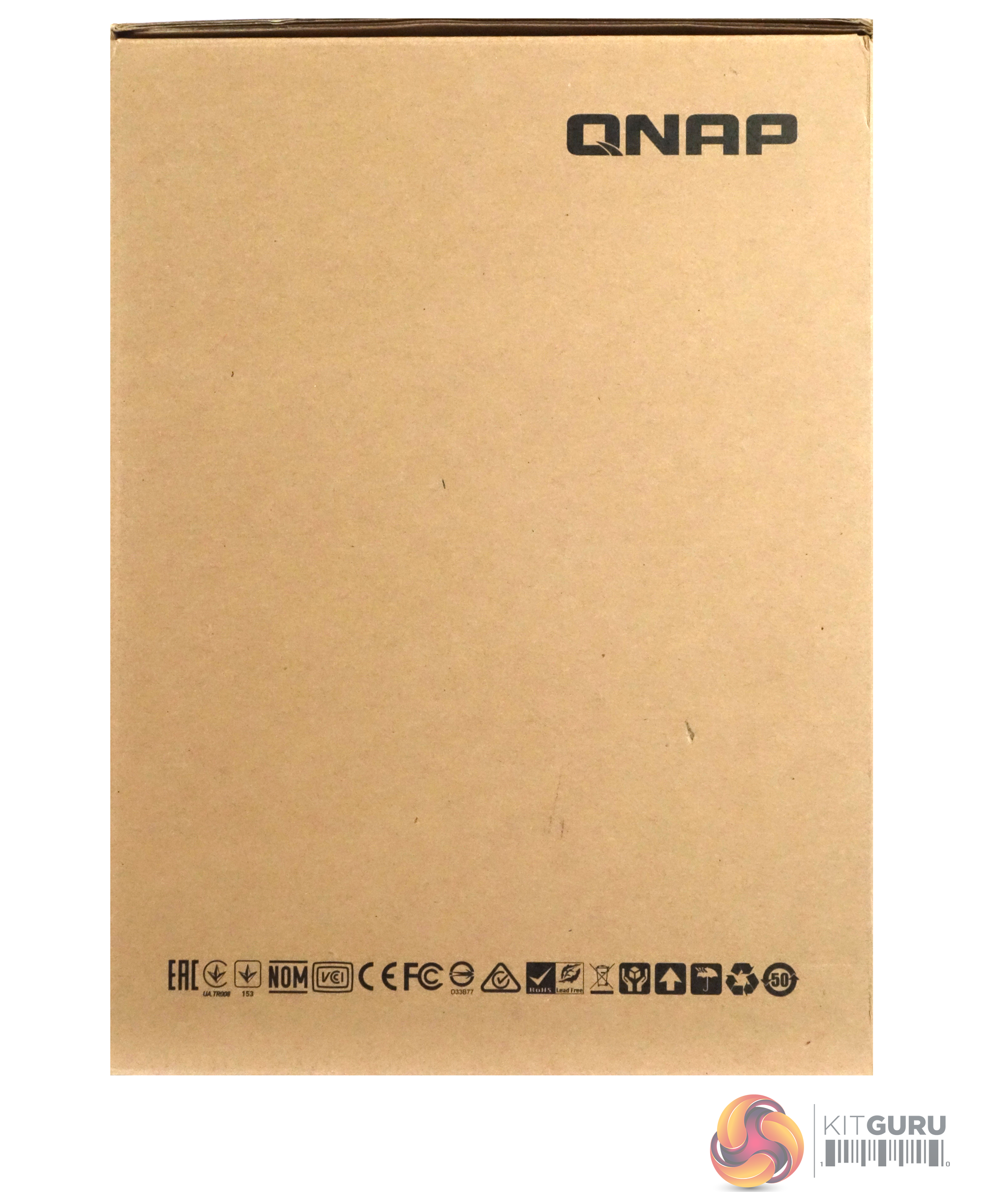 One side of the box has carriage icons on the top left and an HDD compatibility panel on the bottom. The other side just has a double row of carriage and storage icons and marks of the various standards the NAS passes.